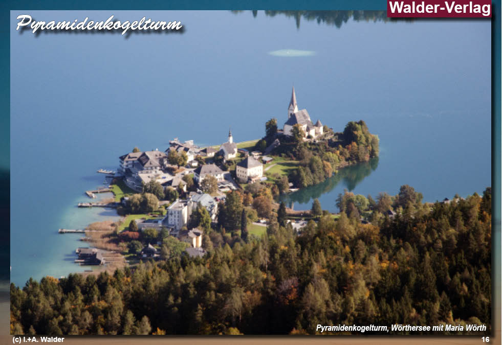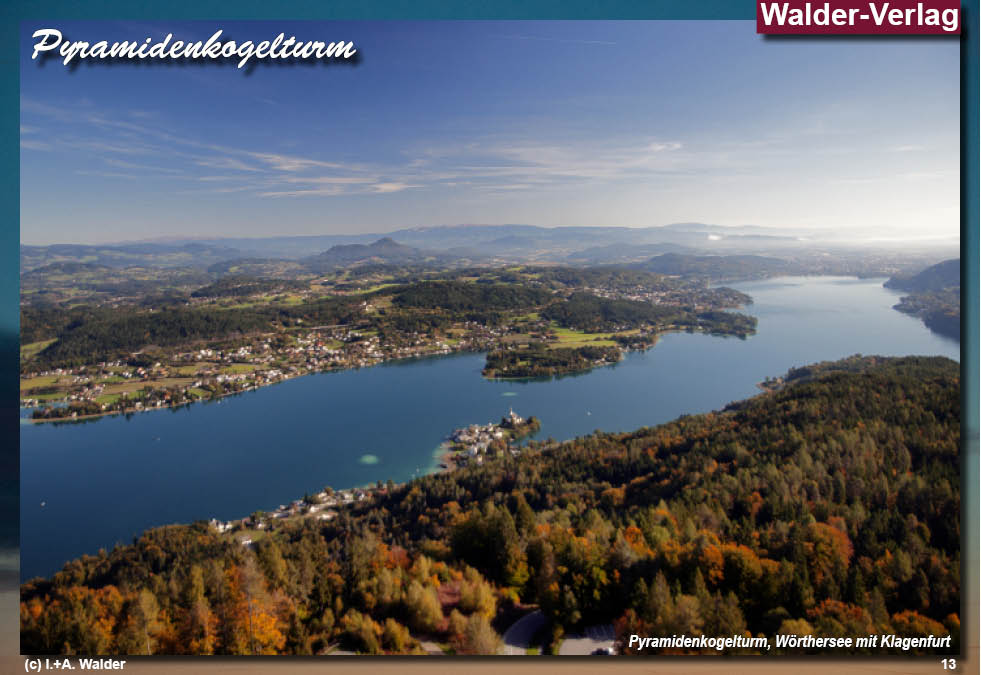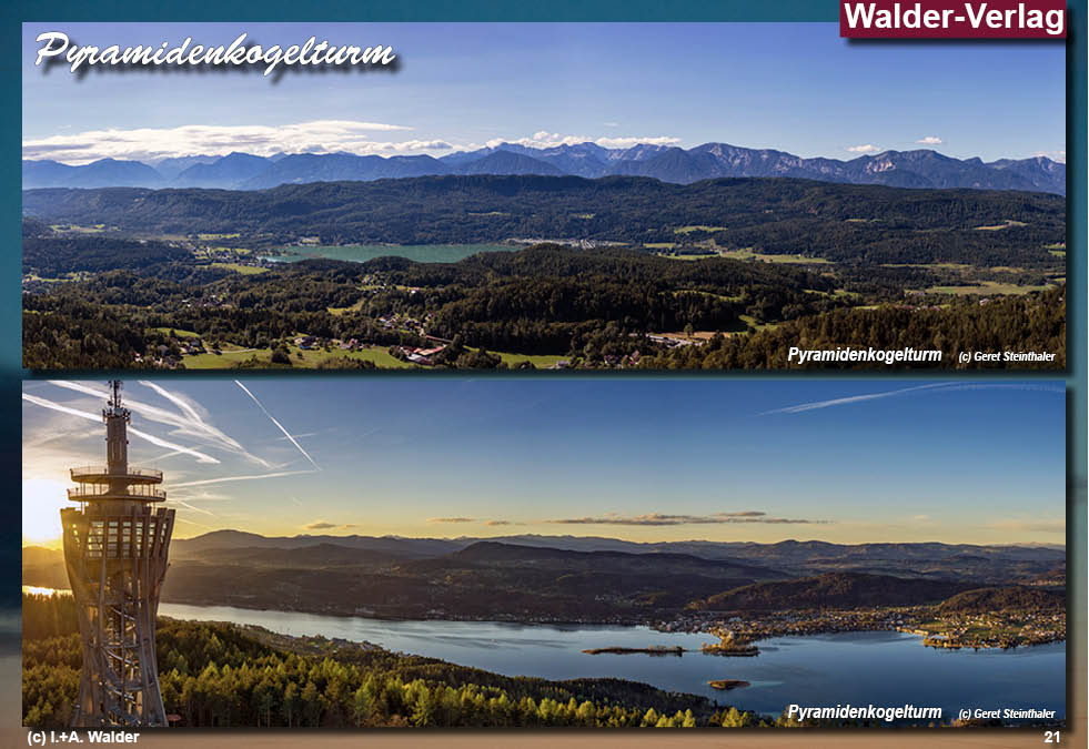 Der Aussichtsturm Pyramidenkogel ist eines der markantesten Wahrzeichen Kärntens und erhebt sich auf dem 851 Meter hohen Gipfel südlich des Wörthersees als eindrucksvoller Aussichts- und Sendeturm. Bereits im Jahr 1950 wurde an dieser exponierten Stelle ein erster hölzerner Aussichtsturm errichtet, dem zwischen 1966 und 1968 ein modernerer Nachfolgebau mit 54 Metern Höhe folgte, der über eine Aufzugsanlage verfügte und Besucher bis zu einer Plattform in 43 Metern Höhe brachte. Der heutige Turm knüpft an diese Tradition an und setzt sie in zeitgemäßer Form fort. Seine innovative, mehrfach strukturierte Architektur aus Holz verleiht dem Bauwerk eine besondere Leichtigkeit und Transparenz. Die äußere Gestalt wird von einer schraubenartigen Konstruktion aus gegeneinander verdrehten Ellipsen geprägt, während senkrechte, geschwungen konturierte Steher aus Leimholz den Turm bis zu zwei übereinanderliegenden Aussichtsplattformen tragen. Unterhalb dieser Plattformen befindet sich ein verglaster Aussichts- und Veranstaltungsraum, der einen beeindruckenden Rundumblick über den Wörthersee, das Rosental und die umliegenden Berglandschaften eröffnet. Der Aufstieg erfolgt wahlweise bequem mit einem transparenten Vertikallift oder sportlich über eine Treppe mit 441 Stufen. Ein besonderes Erlebnis bietet die spiralförmig um den Turm verlaufende Rutsche in Form eines gewendelten Rohrs, die eine rasante Abfahrt ermöglicht und den Besuch um eine außergewöhnliche Attraktion ergänzt. Zusätzliche Akzente setzt die nachträglich installierte, farblich steuerbare Beleuchtung mit insgesamt 164 einzeln ansteuerbaren LED-Strahlern, die die Holzstruktur wirkungsvoll hervorheben und den Turm bei Dunkelheit in ein faszinierendes Lichtspiel verwandeln. Mit einer Gesamthöhe von 100 Metern gilt der Pyramidenkogel als höchster Holzaussichtsturm der Welt und bietet ein Panorama, das zu den eindrucksvollsten Aussichtserlebnissen im Alpenraum zählt. Ein Besuch verbindet eindrucksvolle Architektur mit Naturerlebnis und bleibt sowohl bei Tag als auch bei Nacht nachhaltig in Erinnerung. (c)WV