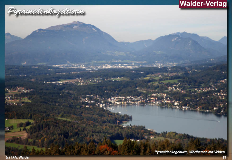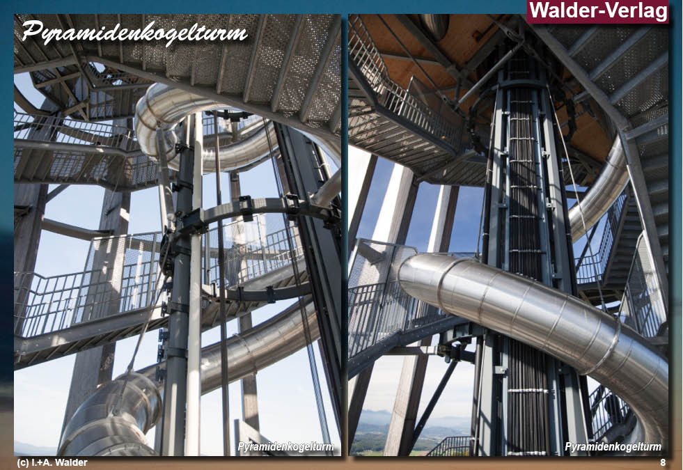 Der Aussichtsturm Pyramidenkogel ist ein Aussichts- und Sendeturm auf dem 851m ü.M. hohen Pyramidenkogel südlich des Wörthersees. Bereits 1950 wurde auf dem Pyramidenkogel ein Aussichtsturm aus Holz errichtet. Ihm folgte der alte Aussichtsturm mit seiner Turmhöhe von 54 Meter, gebaut 1966 bis 1968. Mit einer Aufzugsanlage wurde die erste Aussichtsplattform in 43m erreicht. Der neue Aussichtsturm auf dem Pyramidenkogel ist mehrfach strukturiert und teilweise durchlüftet und stellenweise durchblickbar. Die Einhüllende wird von einer Schraube aus gegeneinander verdrehten Ellipsen gebildet. Senkrechte, plane, doch geschwungen konturierte Steher aus Leimholz reichen hinauf bis zu zwei übereinander liegenden Aussichtsplattformen. Darunter liegt ein verglaster Aussichts- und Veranstaltungsraum. Der Turm integriert einen Vertikallift für Personen mit relativ transparentem Schacht und. ...